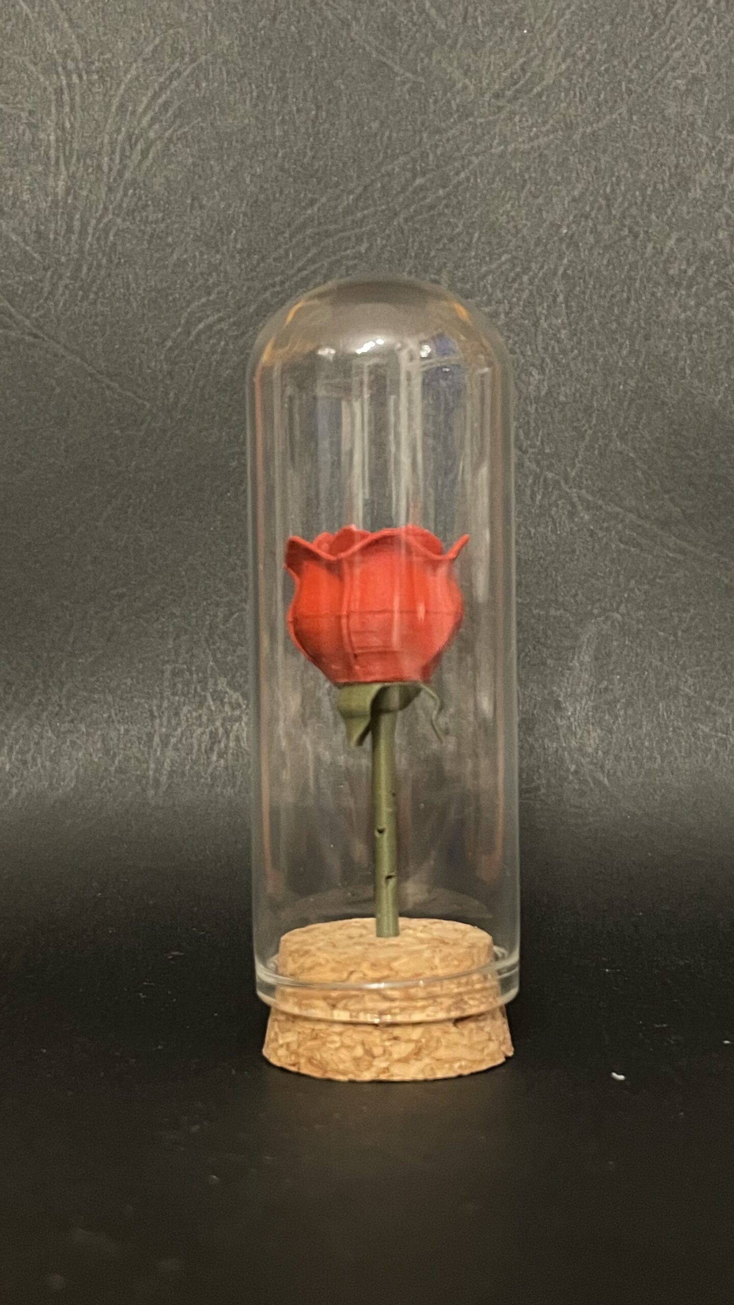 Petite rose imprimée en impression 3D (PLA). La cloche est en verre et mesure environ 80mm de haut.